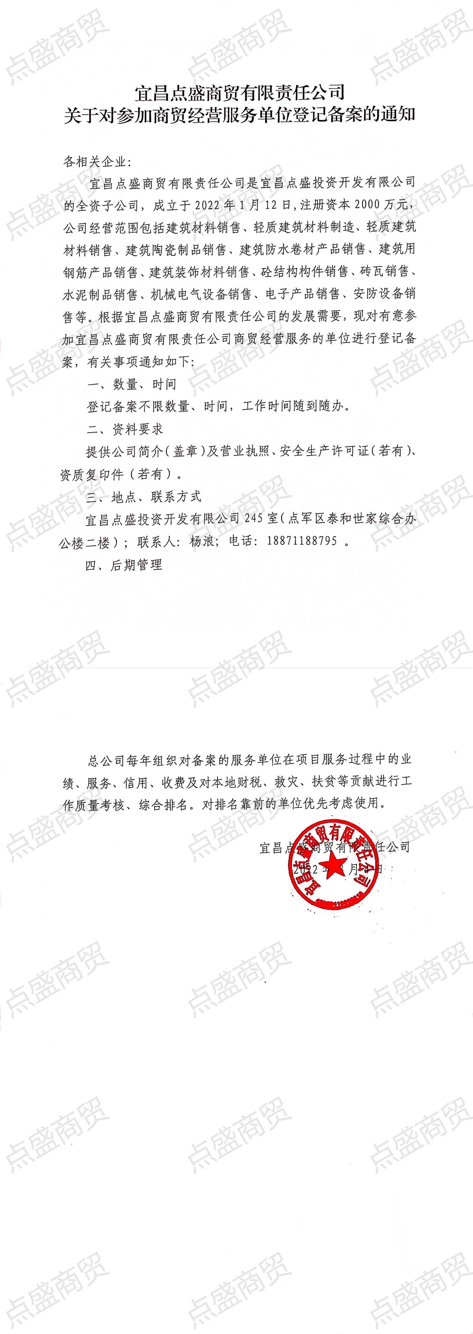 宜昌點盛商貿(mào)有限責任公司關(guān)于對參加商貿(mào)經(jīng)營服務單位登記備案的通知