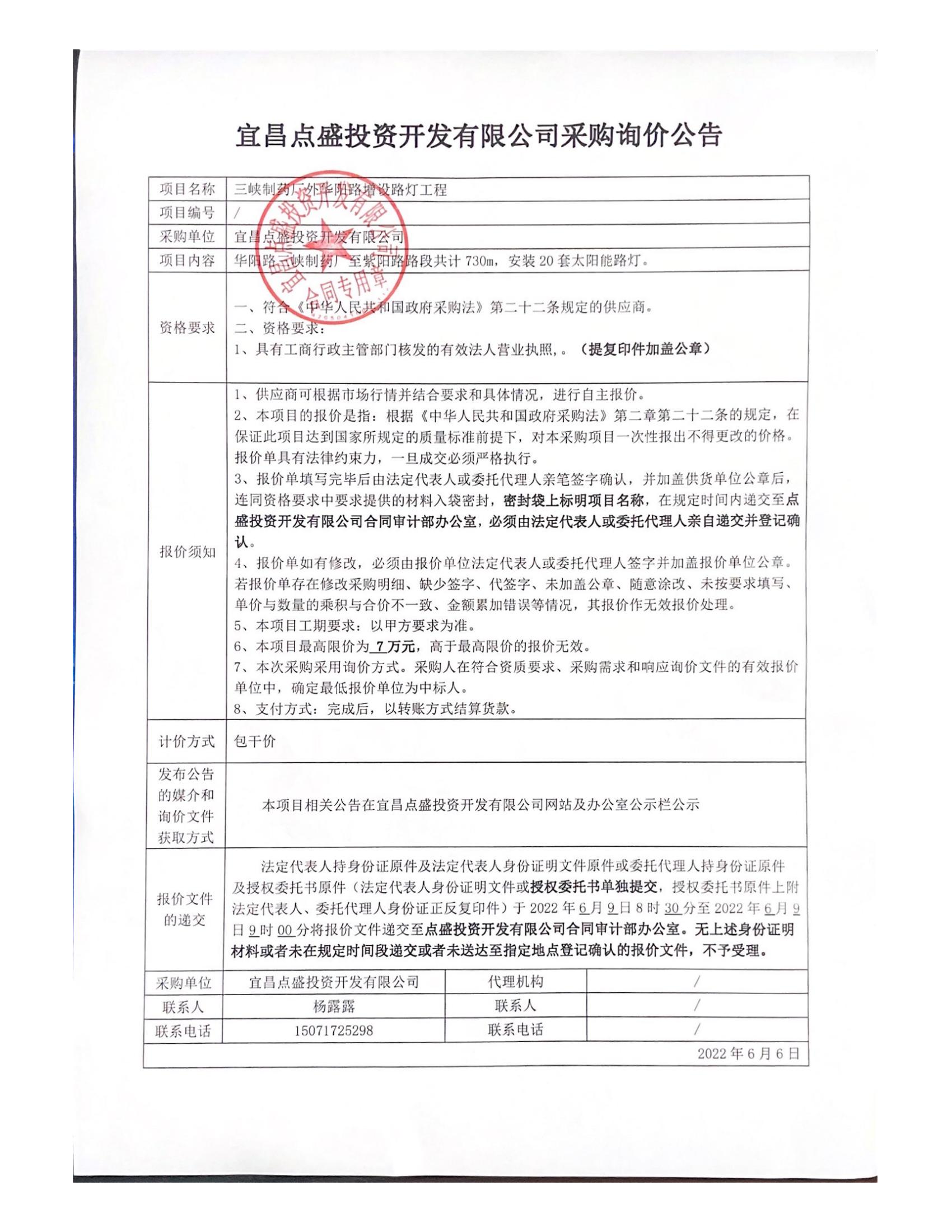 詢價(jià)公告-三峽制藥廠外華陽路增設(shè)路燈工程