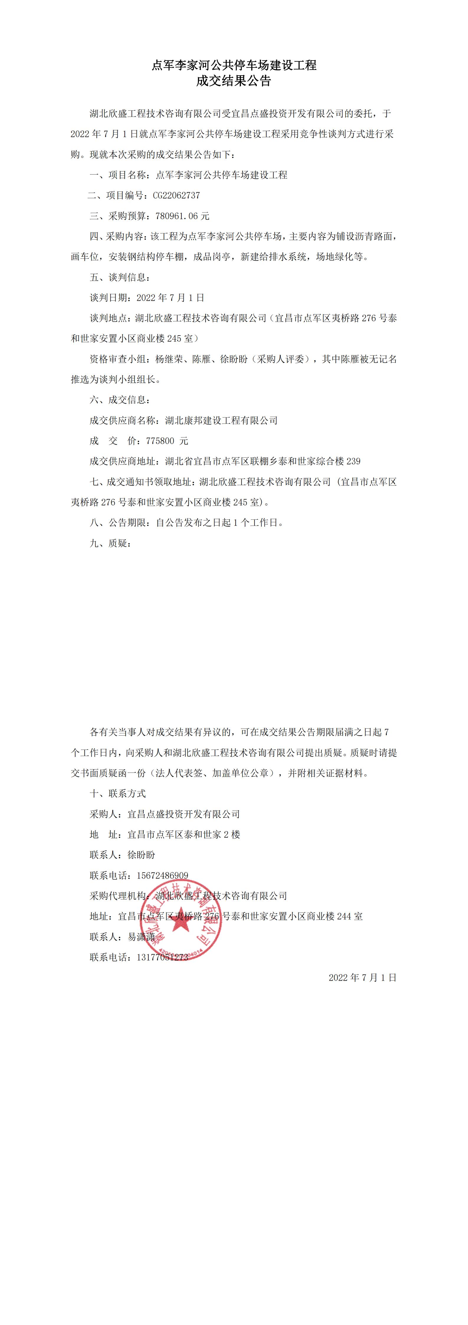 點軍李家河公共停車場建設(shè)工程成交結(jié)果公告