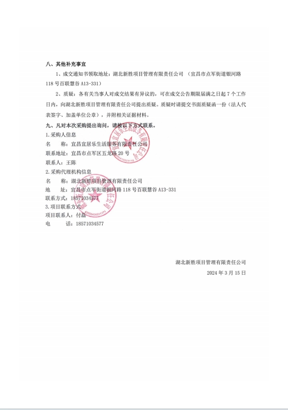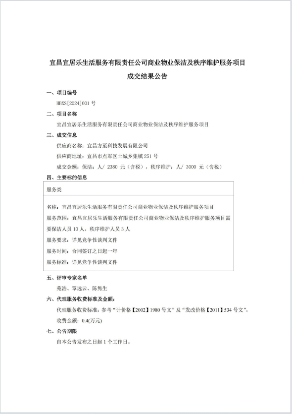 宜昌宜居樂生活服務(wù)有限責(zé)任公司商業(yè)物業(yè)保潔及秩序維護服務(wù)項目成交結(jié)果公告