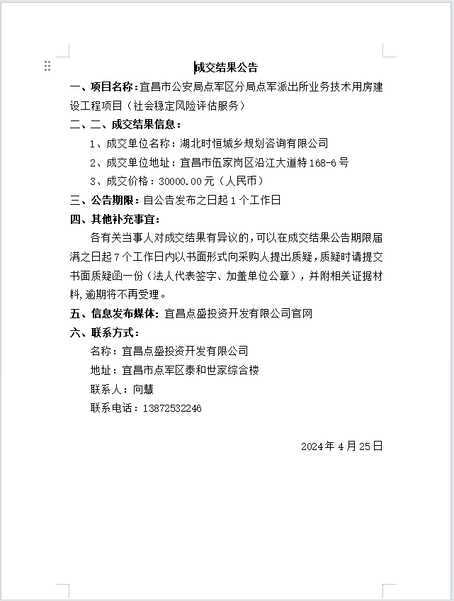 宜昌市公安局點(diǎn)軍區(qū)分局點(diǎn)軍派出所業(yè)務(wù)技術(shù)用房建設(shè)工程項(xiàng)目(社會(huì)穩(wěn)定風(fēng)險(xiǎn)評(píng)估服務(wù))成交公告