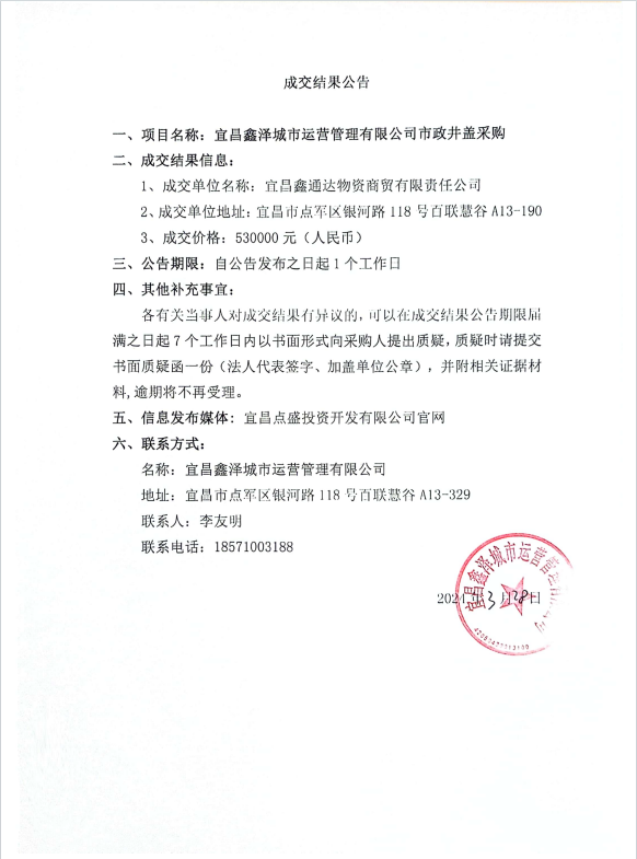 宜昌鑫澤城市運營管理有限公司市政井蓋采購項目成交公告