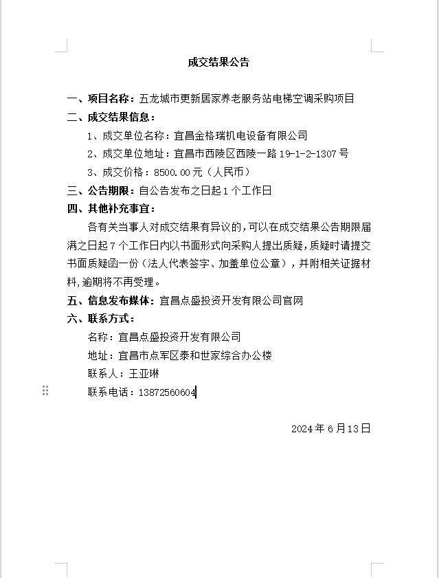 五龍城市更新居家養(yǎng)老服務(wù)站電梯空調(diào)采購(gòu)項(xiàng)目成交公告