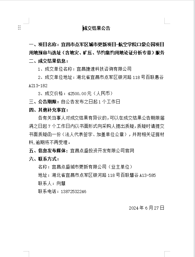 宜昌市點軍區(qū)城市更新項目-航空學(xué)院口袋公園項目用地預(yù)審與選址(含地災(zāi)、礦壓、節(jié)約集約用地論證分析專章)服務(wù) 成交公告