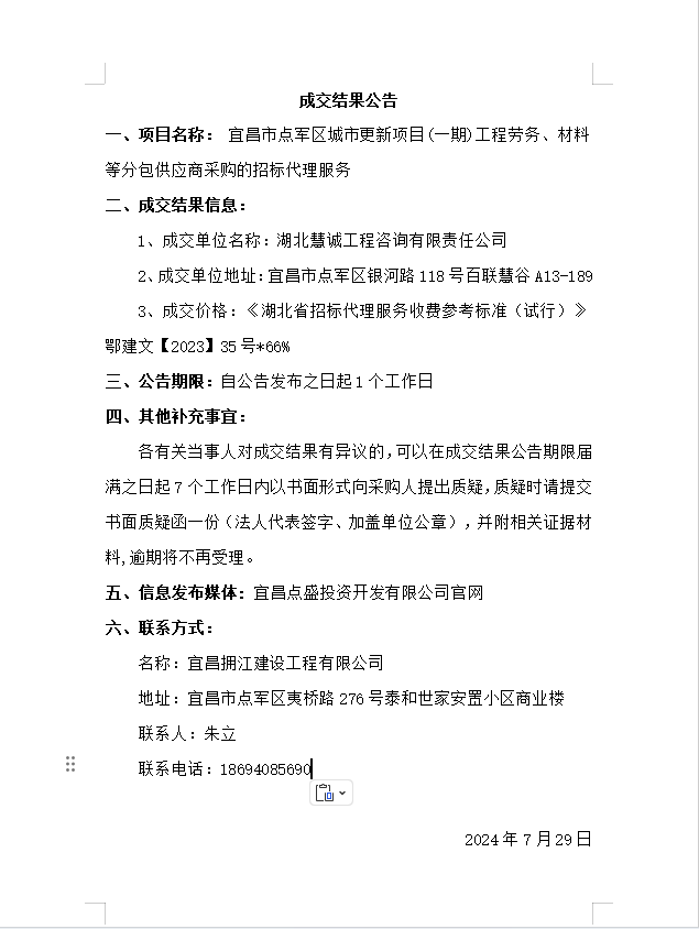 宜昌市點軍區(qū)城市更新項目(一期)工程勞務、材料等分包供應商采購的招標代理服務成交結果公告