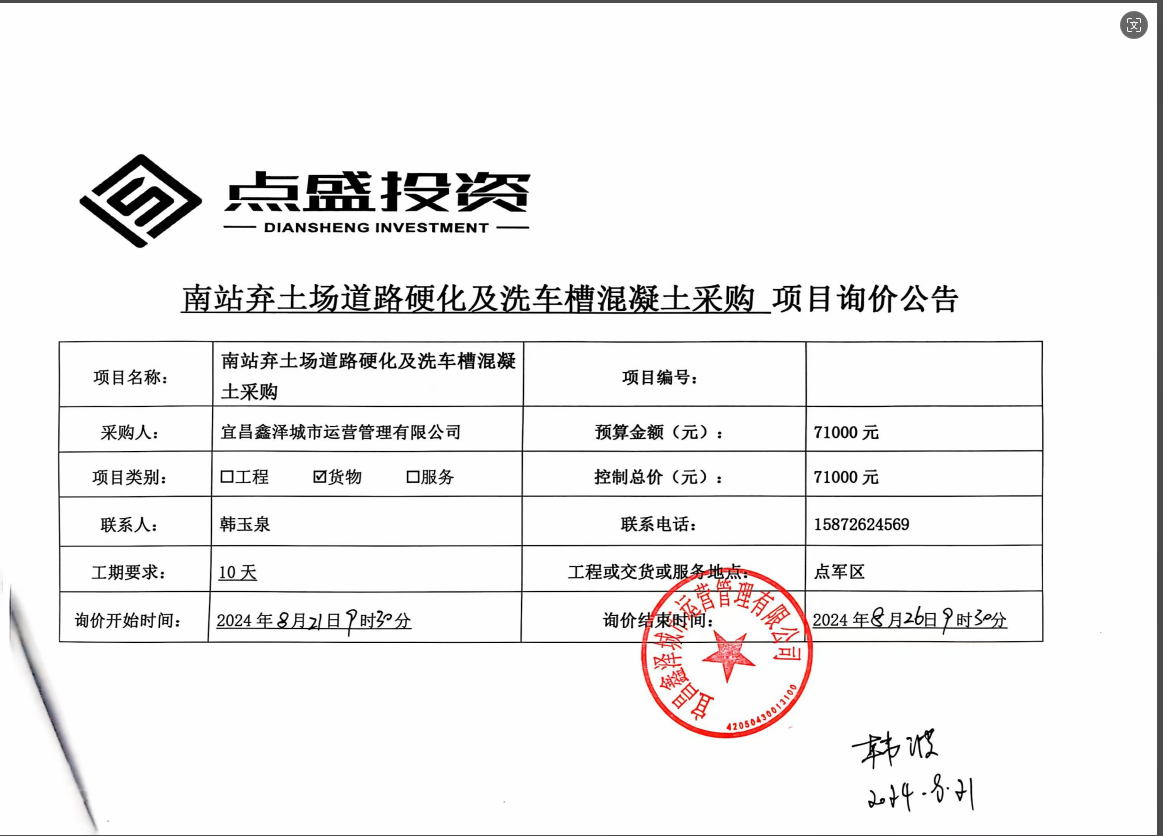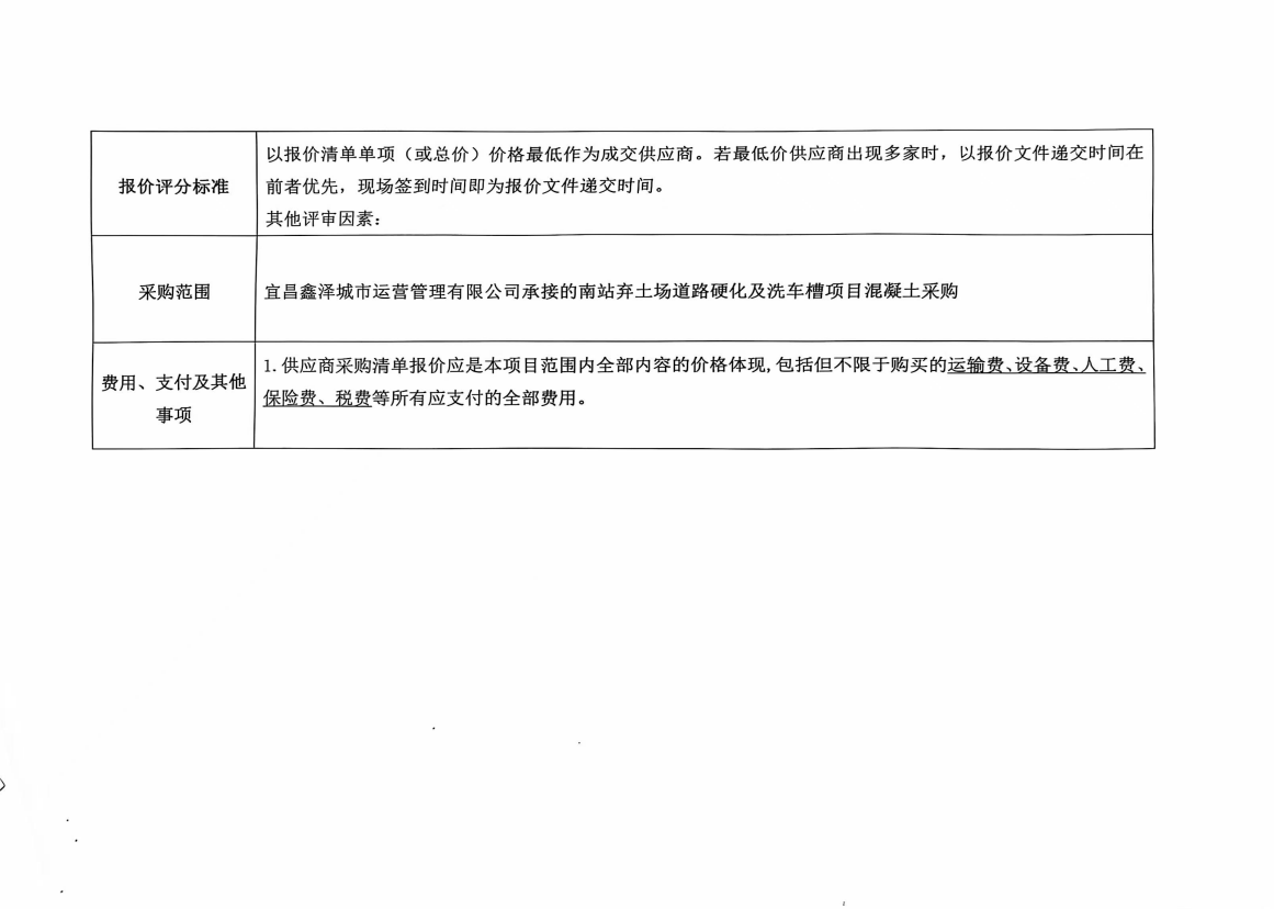 宜昌鑫澤城市運(yùn)營管理有限公司南站棄土場道路硬化及洗車槽混凝土采購項(xiàng)目詢價(jià)公告