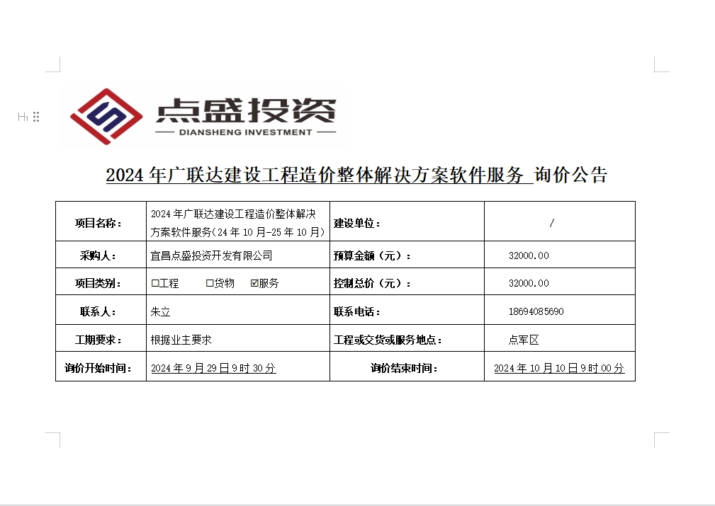 2024年廣聯(lián)達建設(shè)工程造價整體解決方案軟件服務(wù)詢價公告