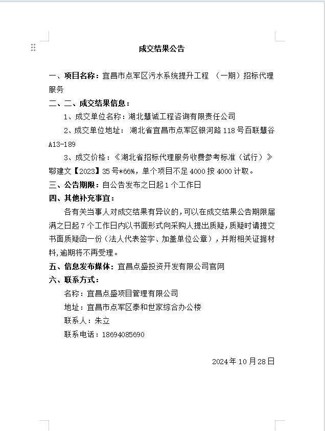 宜昌市點軍區(qū)污水系統(tǒng)提升工程 (一期)招標代理服務成交公告