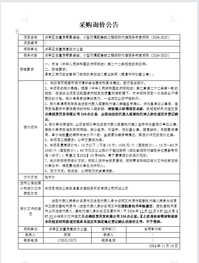 點(diǎn)軍區(qū)安置房零星維修、小型附屬配套類工程招標(biāo)代理服務(wù)年度采購(gòu)(2024-2025)詢價(jià)公告