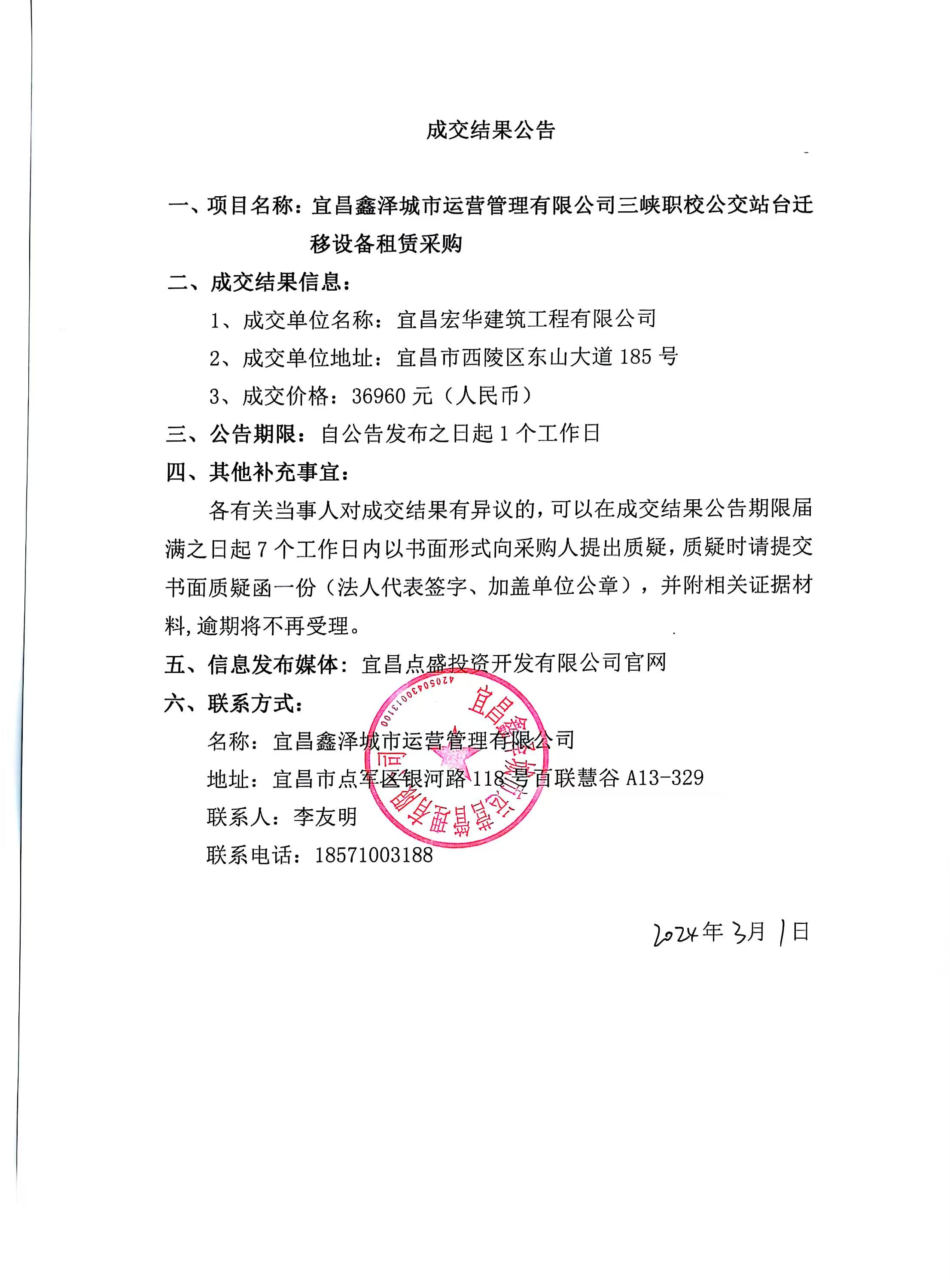 三峽職校公交站臺(tái)遷移項(xiàng)目設(shè)備租賃采購(gòu)成交公告