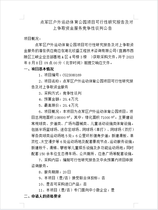 點(diǎn)軍區(qū)戶外運(yùn)動(dòng)體育公園項(xiàng)目可行性研究報(bào)告及對(duì)上爭(zhēng)取資金服務(wù)談判公告